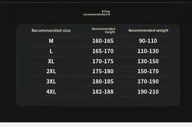 Sizes Available: M (45-55kg), L (55-65kg), XL (65-75kg), 2XL (75-85kg), 3XL (85-95kg), 4XL (95-105kg).