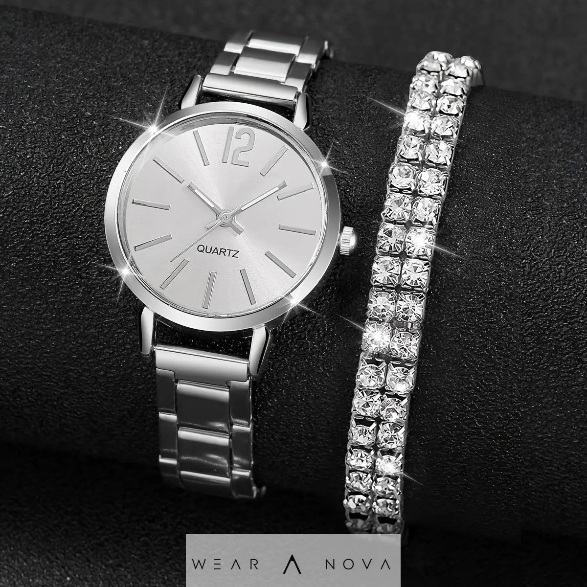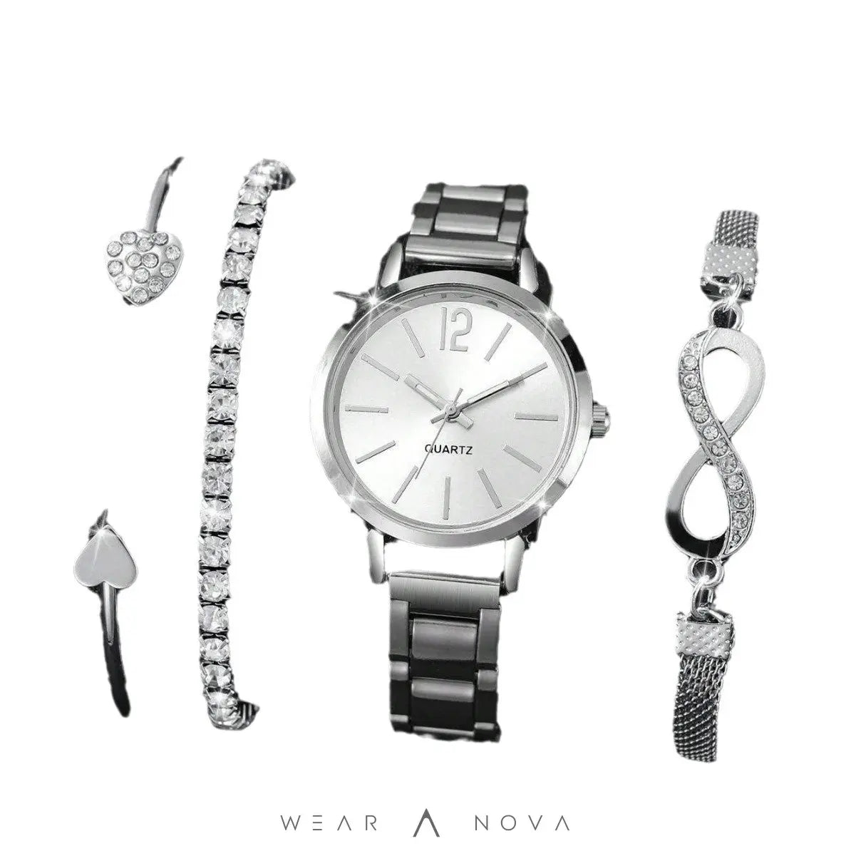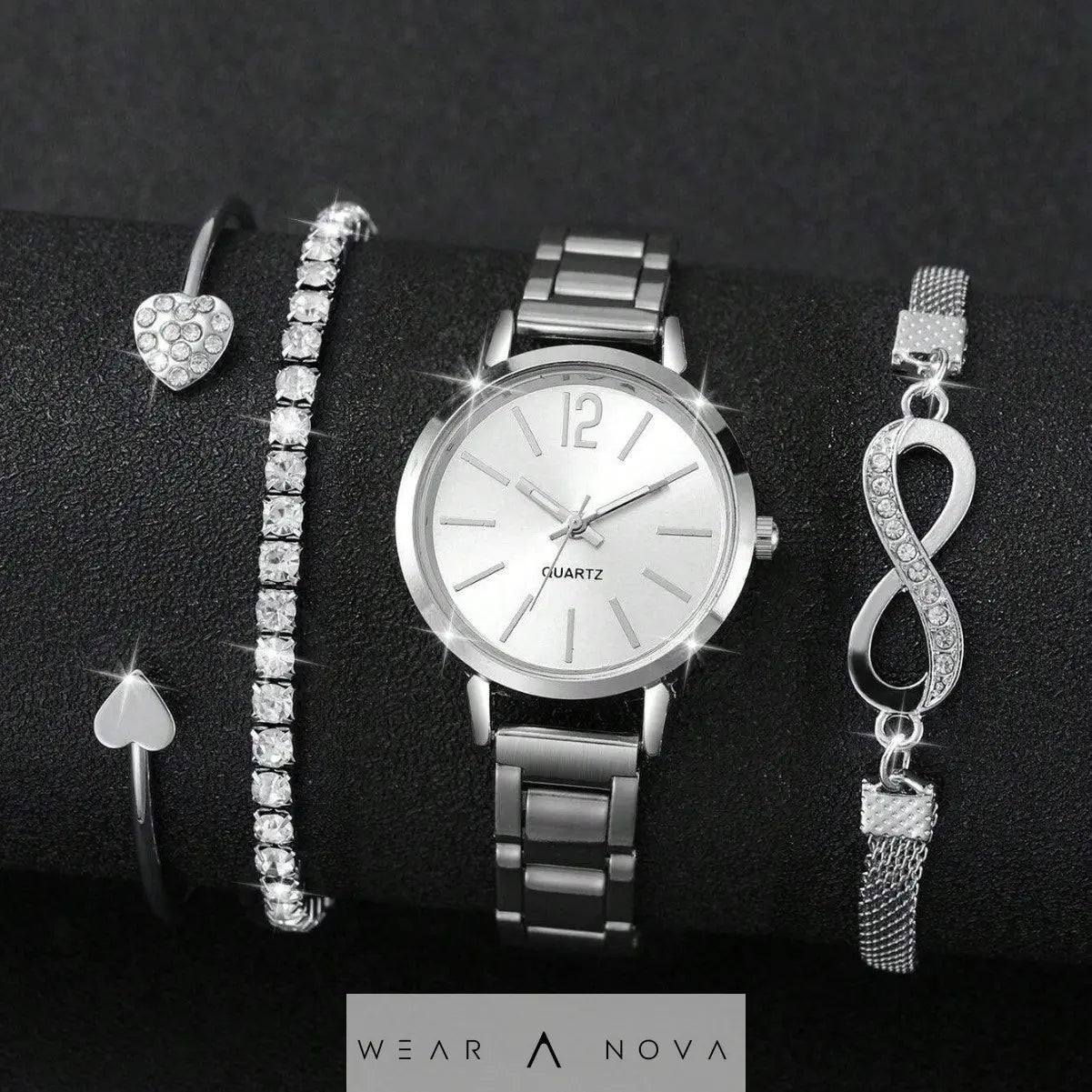This High-quality steel bracelet ladies' watch is available in multiple color options gold, rose gold, and silver as well as stylish bracelet combo sets for a coordinated look. Its polished finish and comfortable band make it suitable for daily wear, while the decorative bracelet pairings add a trendy, feminine touch. Whether you're upgrading your accessory collection or searching for a thoughtful gift, this watch delivers lasting quality and timeless beauty.